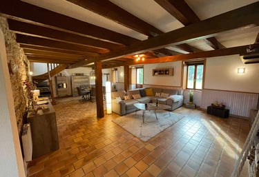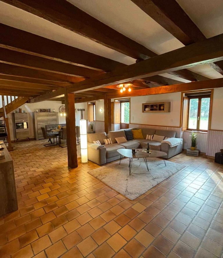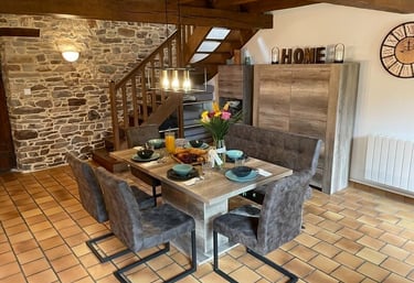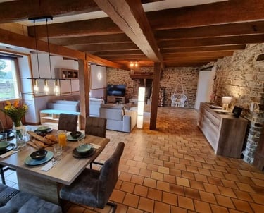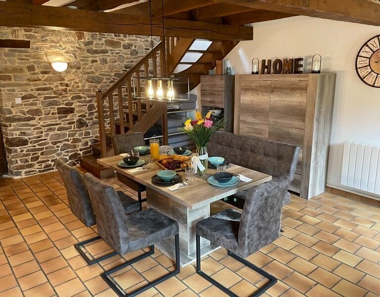Inmitten der Südbretagne empfängt Sie dieses liebevoll gestaltetes Landhaus mit typischen Charme: Natursteinmauern, freiliegende Holzbalken und ein weitläufiger Wohnbereich bilden das Herzstück - perfekt für gemeinsame Stunden, Gespräche am Kamin oder gesellige Mahlzeiten rund um den großen Tisch.
