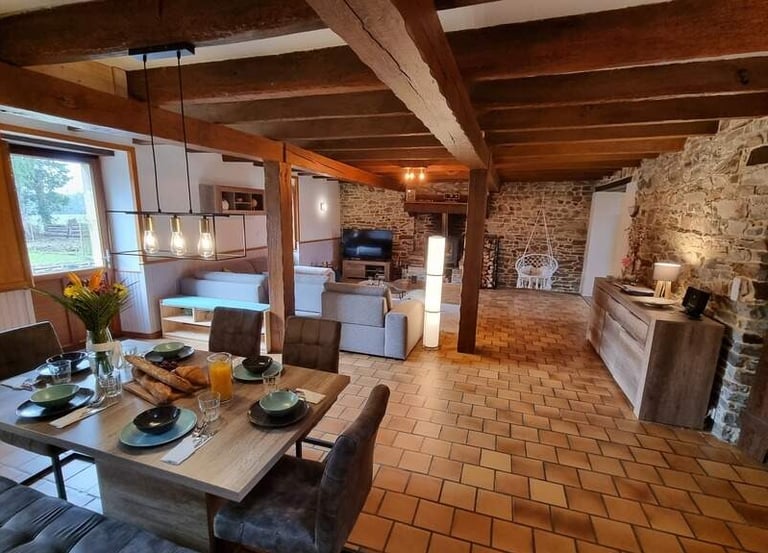 Versteckt zwischen Wiesen, Hecken und kleinen Landstraßen liegt die großzügige Gîte La Maison Neuve. Hier ist mit insgesamt 120 qm Platz für bis zu sechs Personen.